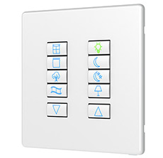 Scene selection is achieved via an elegant pushbutton plate. The iCON control plate utilises black or white rectangular push buttons that are available in a range of standard icons or that can be custom laser engraved with text, icon or language.