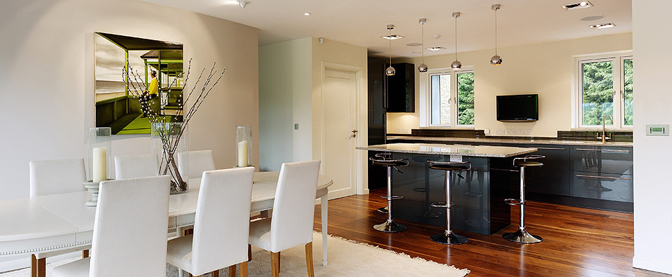 The brief for the project was to create light open plan spaces and utilise the latest in eco-friendly systems including lighting controls working together as part of a property wide wirelessly controlled system. The client had previously selected a separate PC based touch-screen control system to be the main user interface and the Evolution system from Mode Lighting was selected to link in with the PC system.