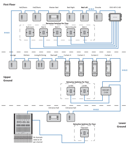 The highly flexible nature of Evolution allows control of the open plan areas and individual rooms including blind controls and whole house commands for welcome and exit settings, party modes etc. Lighting and blinds are controlled by either Evolution keypads located at regular switch positions or by the wireless control system.