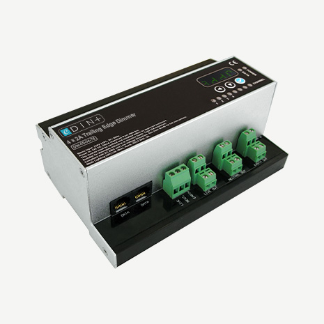 A four circuit Trailing Edge mains Dimmer Module for the control of resistive lighting loads including compatible LED loads. A custom designed housing provides reliable power handling in a compact format.