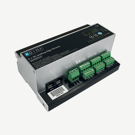 An eight circuit Leading Edge mains Dimmer Module for the control of resistive and inductive lighting loads including compatible LED loads with the facility to select dimming or switched only operation of any circuit. A custom designed housing provides reliable power handling in a compact format.