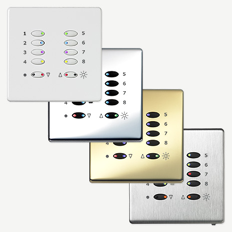 The Tiger Control Plate provides simple scene setting control of an area or zone of lighting. The Control Plate can be setup during installation to provide up to 8 scenes ON/OFF, FADE UP/DOWN control of a single area, or two areas of control each with four scenes plus ON/OFF.
